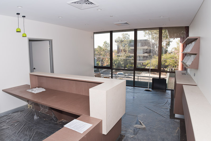 Our honed limestone reception counter and other bench-tops have just been installed. The glass splash-back behind the treatment room sink has also been installed, which certainly adds some colour to an otherwise fairly clinical-looking room. Unfortunately there are still lots of small details to be taken care of, but we are gradually getting closer to …